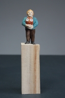 Die Skulpturen sind ungefähr 19 cm hoch, davon die Figur 7 cm. Geschnitzt sind sie aus Lindenholz, die Farbe ist Acryl.